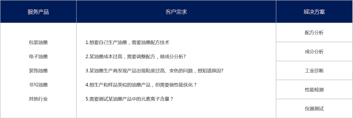 水性油墨、丝印油墨、印刷油墨、环保油墨、玻璃油墨、胶印油墨、瓷器印刷油墨、感光印刷油墨、绝缘层印刷油墨、防伪油墨等成分剖析、成分检测、性能改进、工业诊断类技术服务;